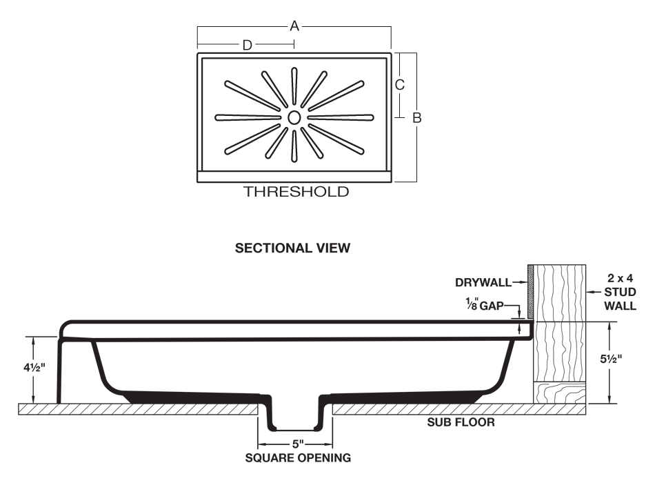General: Furnish and install as shown on plans, DURABASE® Shower Floor Model: _______ , as manufactured by E. L. Mustee & Sons, Inc. Floor to be one-piece, molded fiberglass, made with matched metal molds. Surface to be slip-resistant Starburst® design. Size: _______” x _______”. Shoulder will be no less than 3″ high or less than 1″ wide. Tiling flange will extend not less than 1″ higher than the threshold which provides an integral molded water barrier. Threshold will be not less than 4 1⁄2″ high. Molded-in drain and drain seal for installation of 2″ iron DWV (Sch. 40) PVC or ABS sanitary drain pipe. Removable strainer. Shall meet ANSI Specification Z 124-2022. Color: _______ (White, Bone, Biscuit).