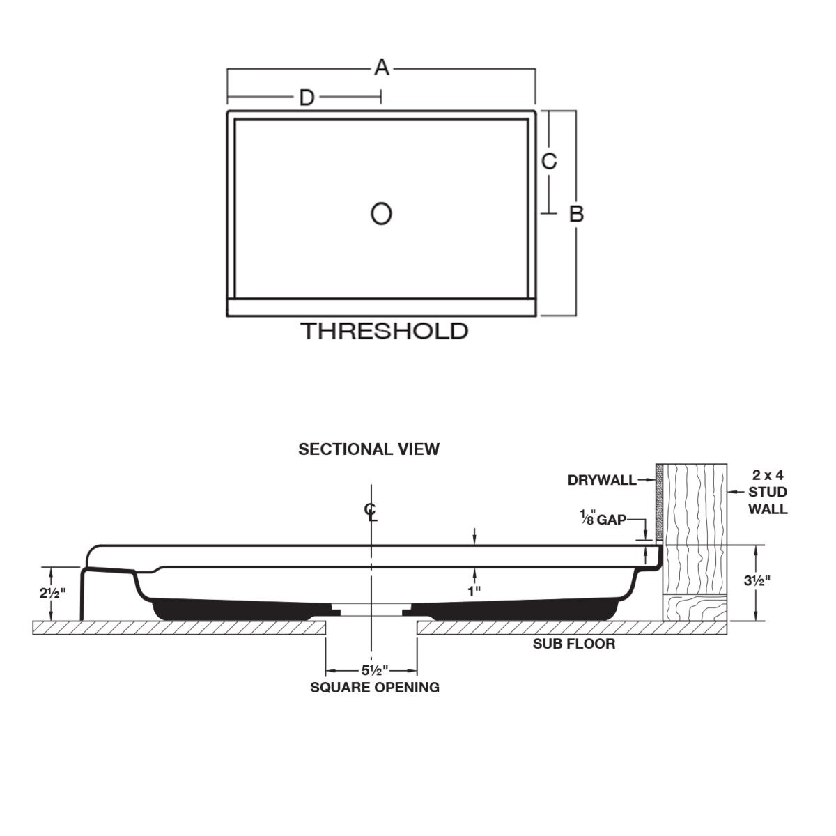General: DURABASE-LP® rectangular, single threshold shower floor Model: ______ as manufactured by E.L. Mustee & Sons, Inc. Floor to be one-piece, molded fiberglass, made with matched metal molds. Surface to be slip-resistant Pebble Grain design. Size ___” x ___”. Tiling flange will extend not less than 1″ higher than the threshold which provides an integral molded water barrier. Threshold will be not less than 2 ½” high. Center drain opening accommodates multiple third-party drain assemblies. ANSI Specification Z 124-2022. Color: White